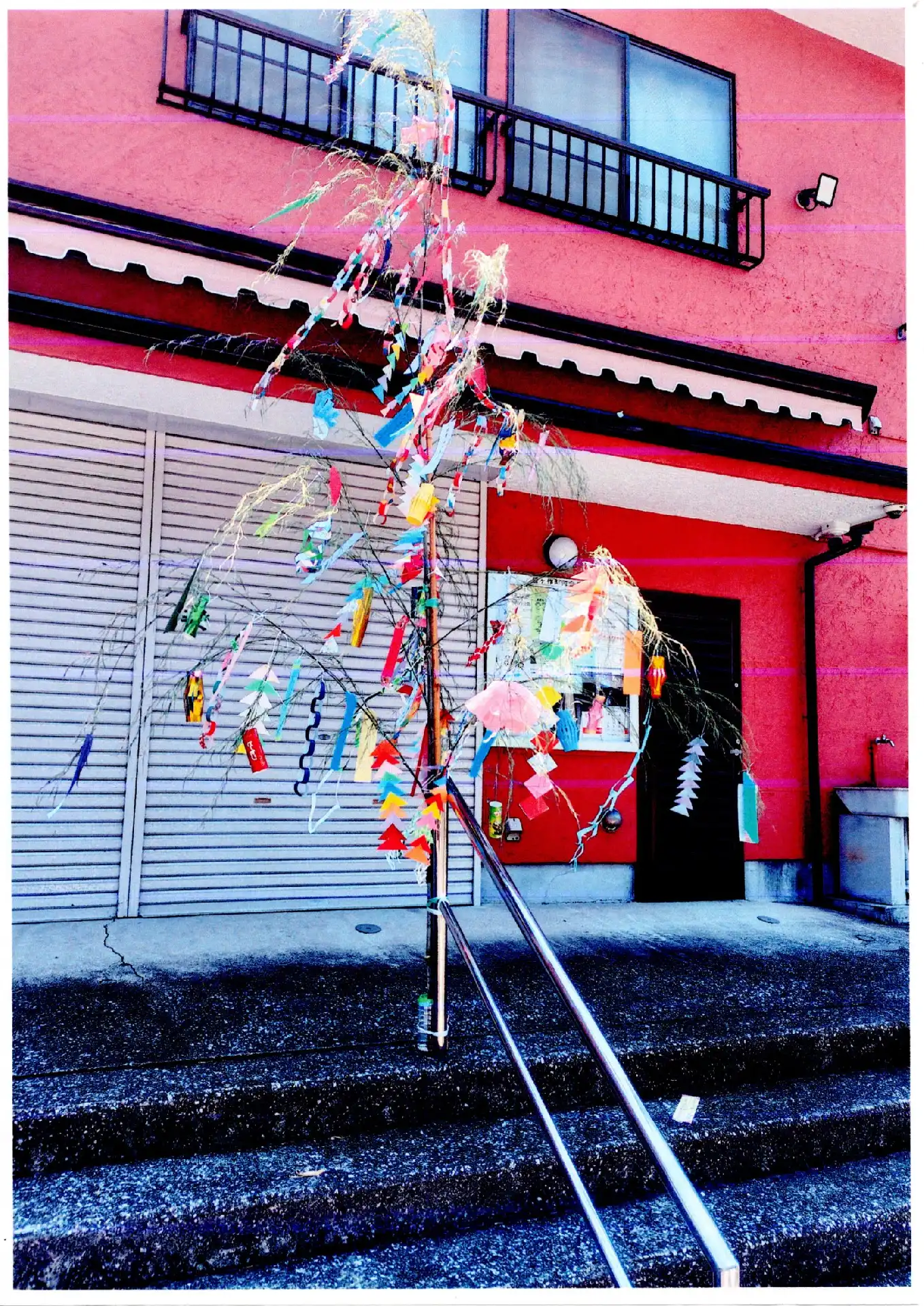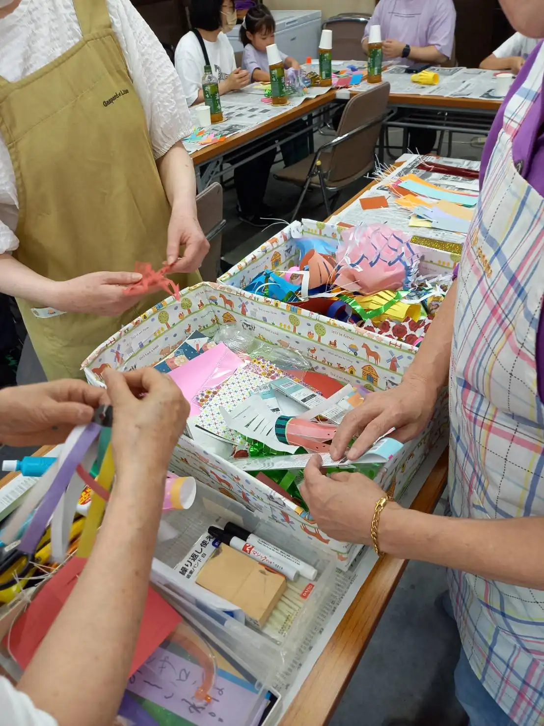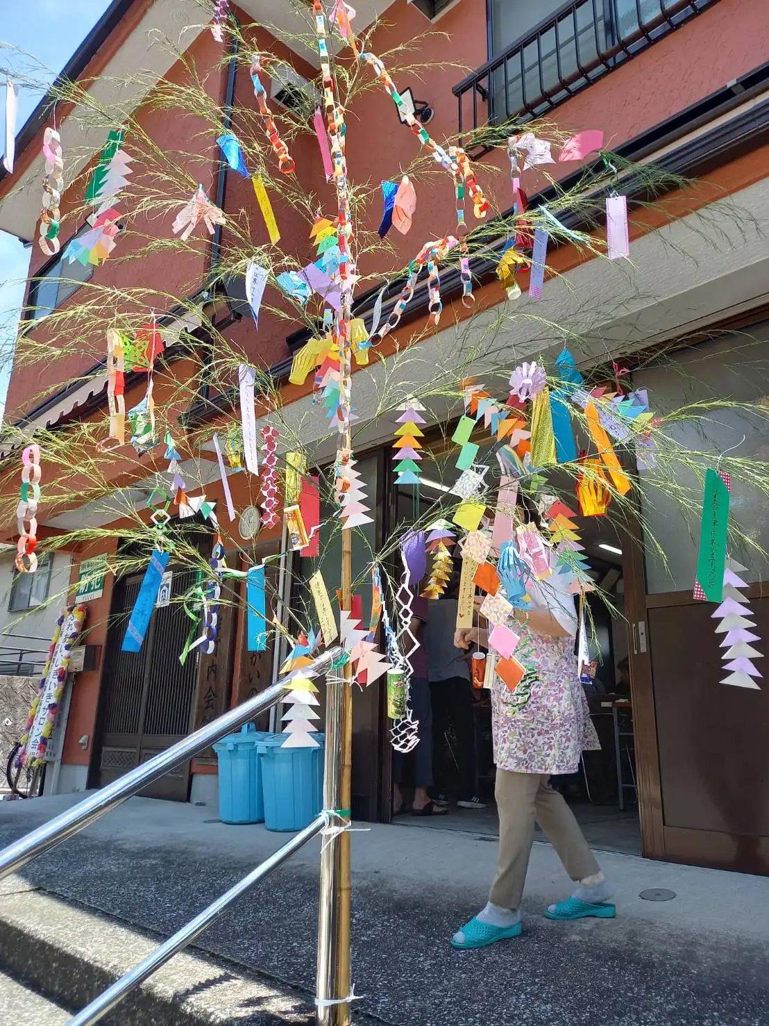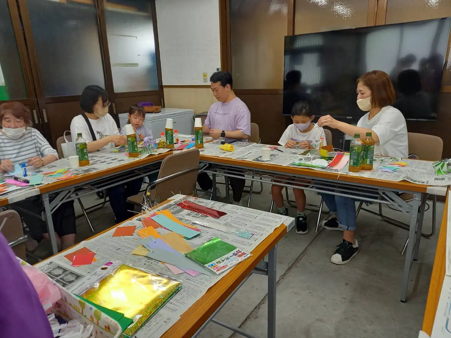 2023年6月30日、七夕飾りを作り、笹に取り付け、町内会館前に飾りました。