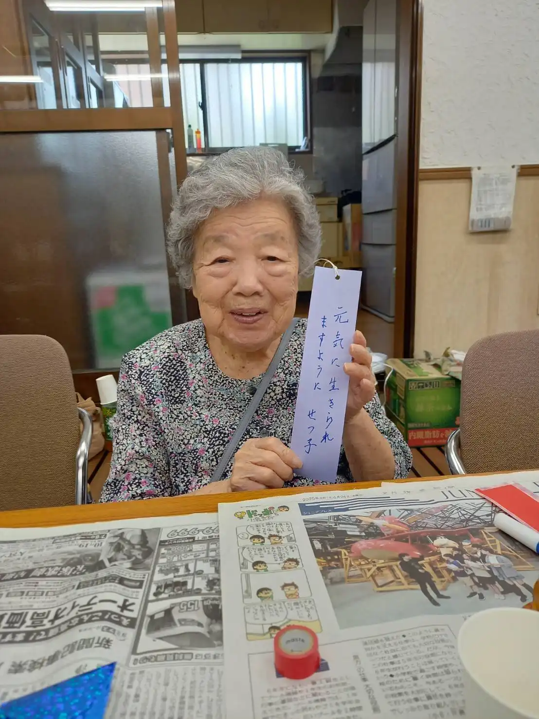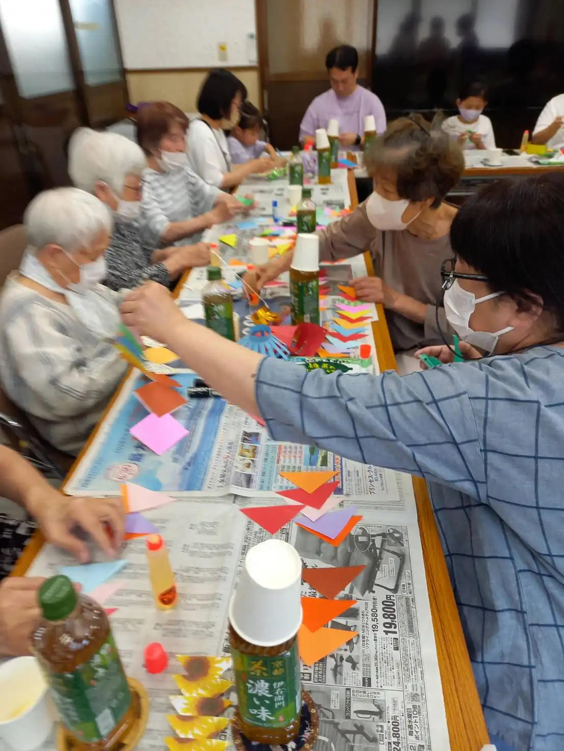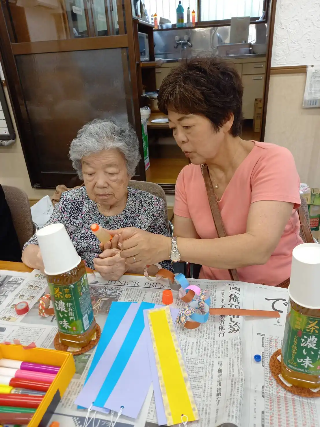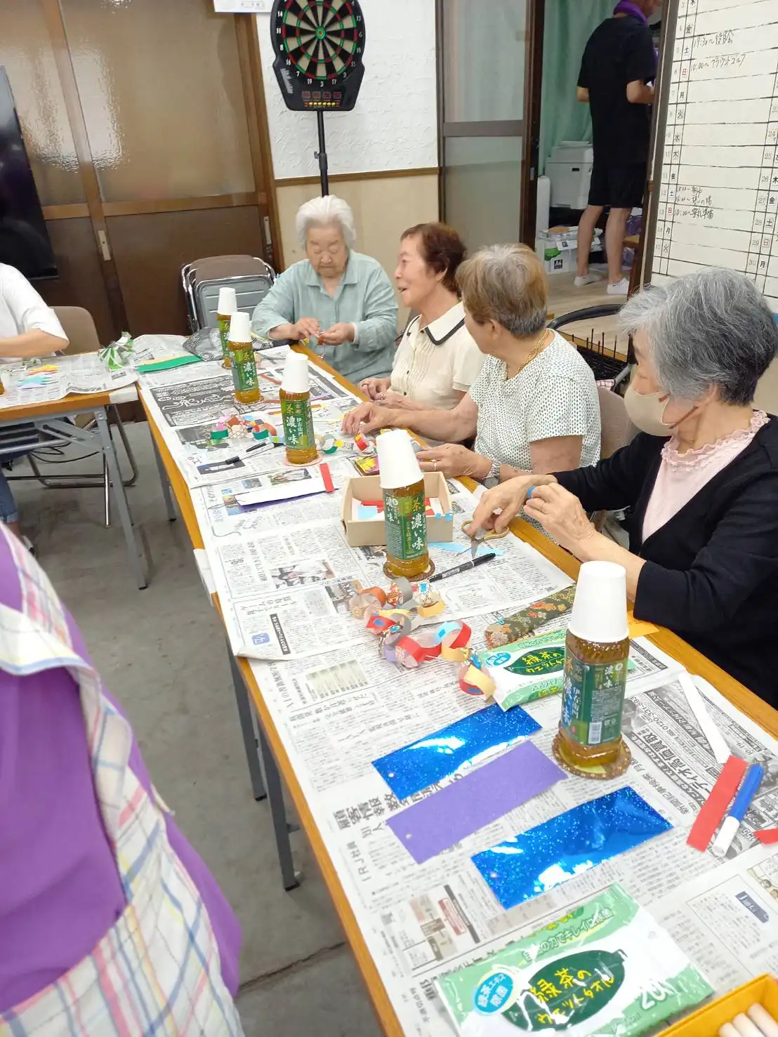 いきいきサロンで七夕飾りを作り、町内会館前に飾り付けました。